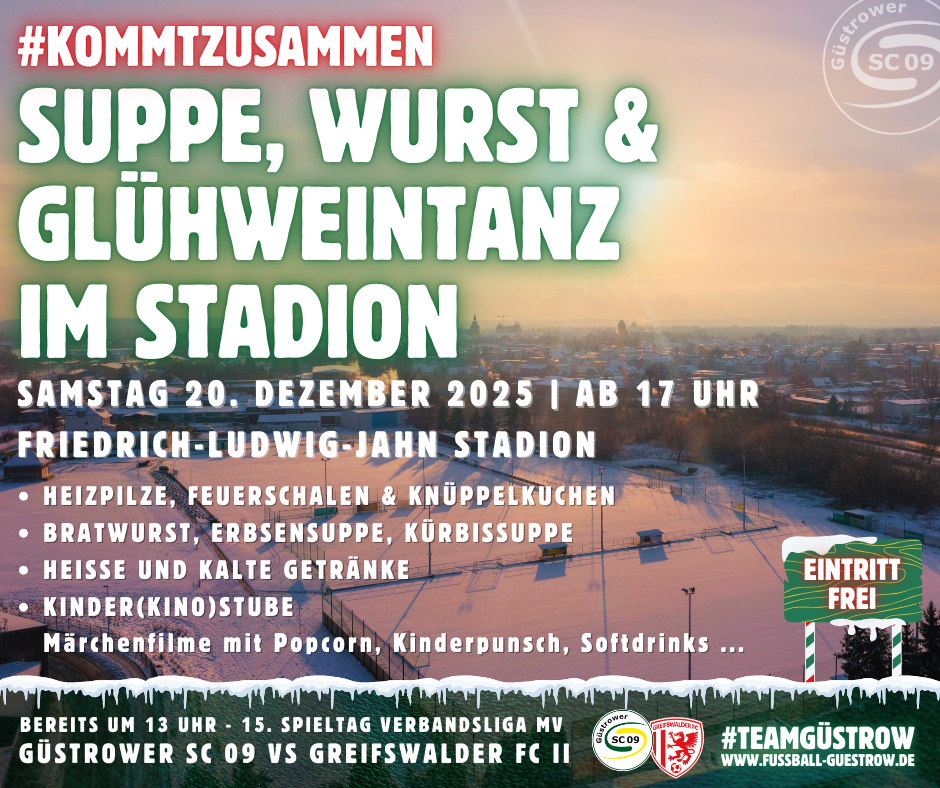 Am Samstag, den 20. Dezember 2025, verwandelt sich das Friedrich-Ludwig-Jahn-Stadion in Güstrow in einen Ort voller Wärme, Licht und Gemeinschaft. Unter dem Motto „Suppe, Wurst & Glühweintanz“ laden wir alle herzlich ein, die Vorweihnachtszeit mit uns gemeinsam zu feiern.